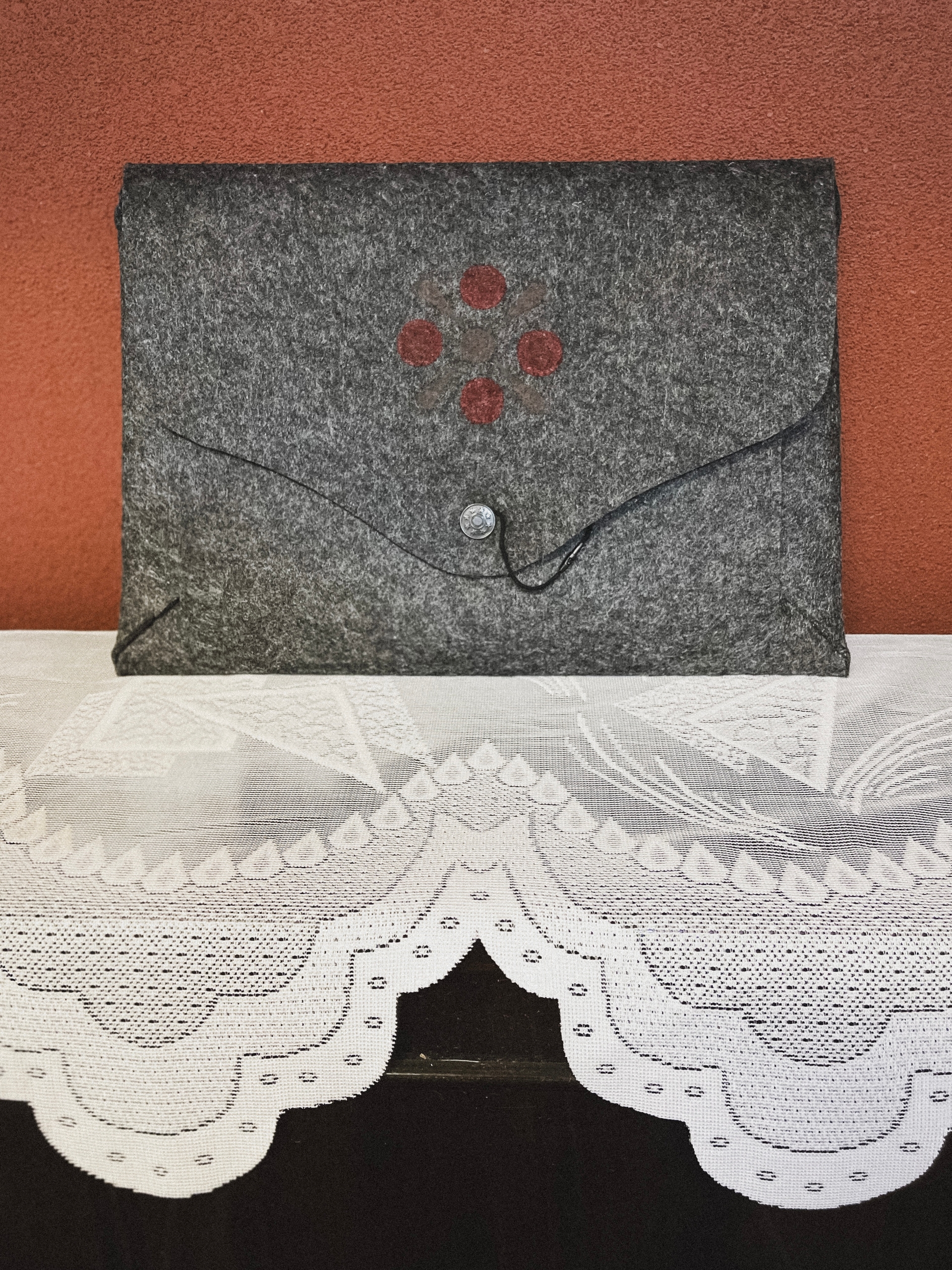 Изготовлен из нетканого материала в традициях Онежской росписи, застежка на металлической пуговице со звёздами.