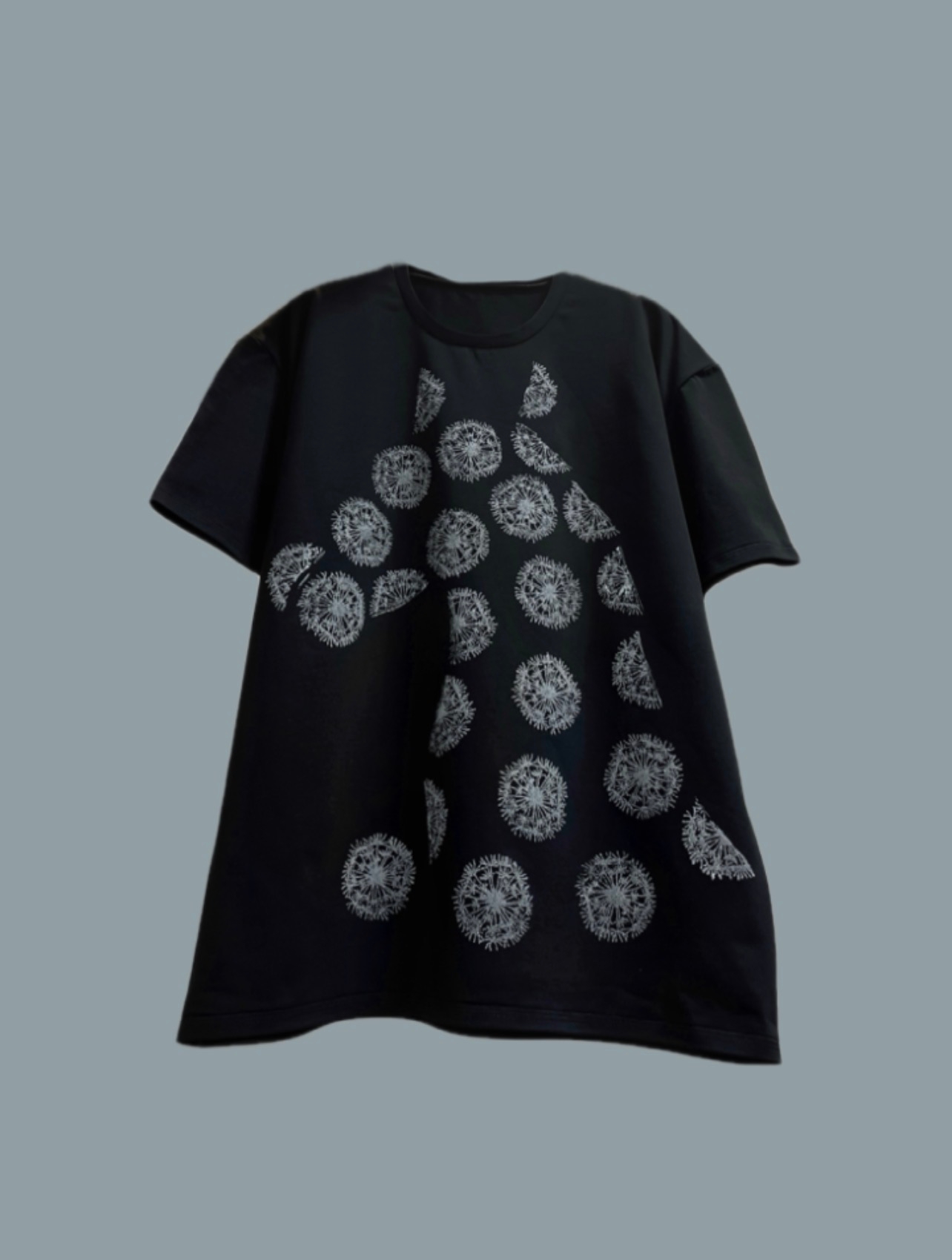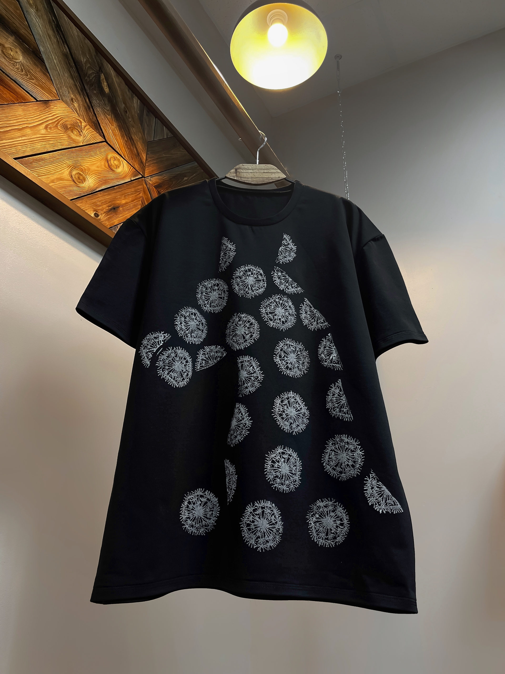 Чёрная футболка большого размера с оригинальным ручным принтом «Конь морозный». Принт выполнен в виде морозных узоров одуванчиков, образующих силуэт коня — выглядит эффектно и необычно. Свободный крой обеспечивает комфорт, короткие рукава и классический круглый вырез делают модель универсальной.