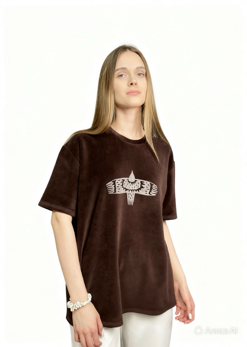 Футболка, в оттенке «Недры Земли», созданная из деликатного мягкого велюра, подарит непередаваемое чувство комфорта и уюта, став любимым элементом гардероба для повседневных образов