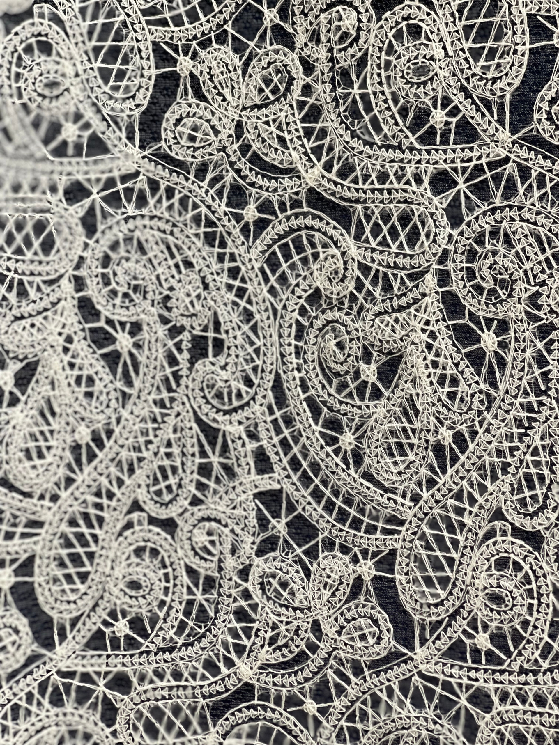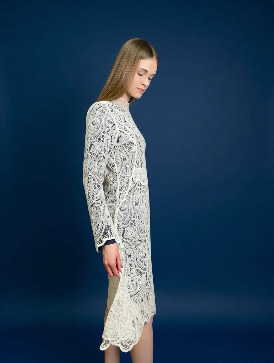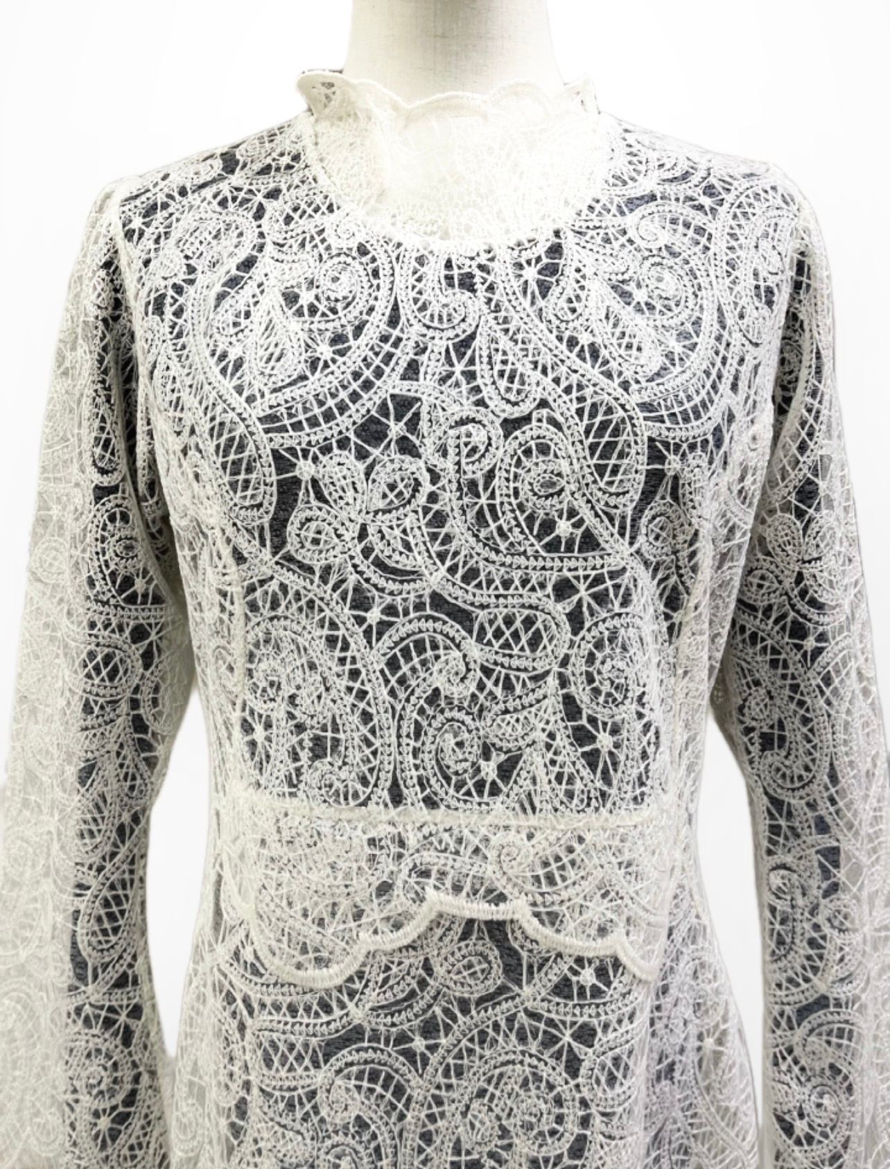Платье кружевное в винтажном стиле 70-х годов — воплощение романтической эстетики. Молочно-бежевый оттенок, расклёшенные рукава и подол подчёркивает женственность силуэта. Подклад выполнен из эластичной мягкой сетки синего цвета