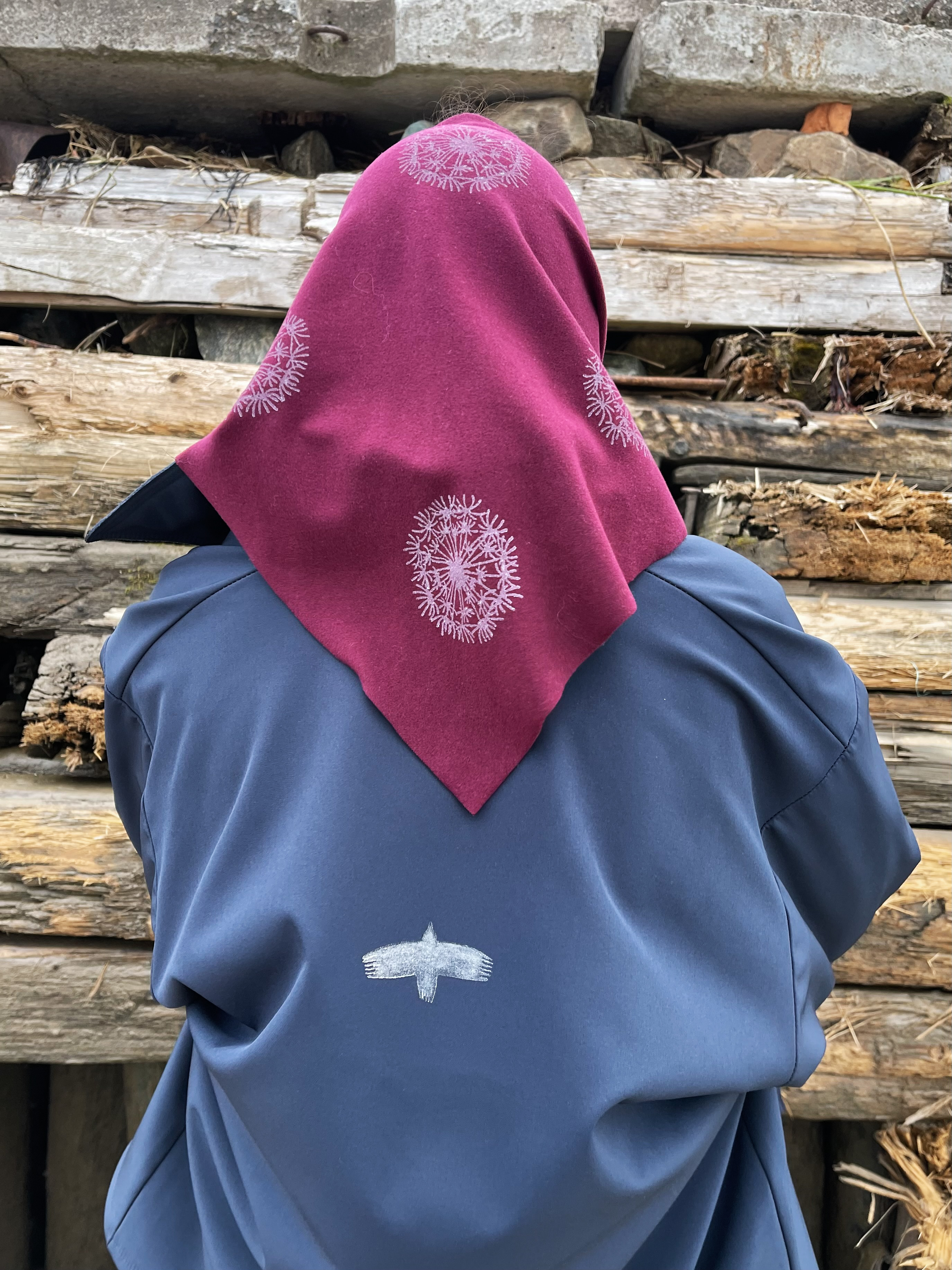 Платок Одувáн от онежского бренда "ОДЁХА" с северным принтом одуванчики, выполненные вручную в технике верховой набойки.